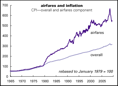 Since 1979, inflation in airfares has averaged 5.9% a year, vs. 3.8% for the overall CPI. From 1964, when the airfare subindex begins, to 1979, plane travel lagged overall inflation—an annual average of 4.4% for airfares, vs. 5.4% for the headline CPI.