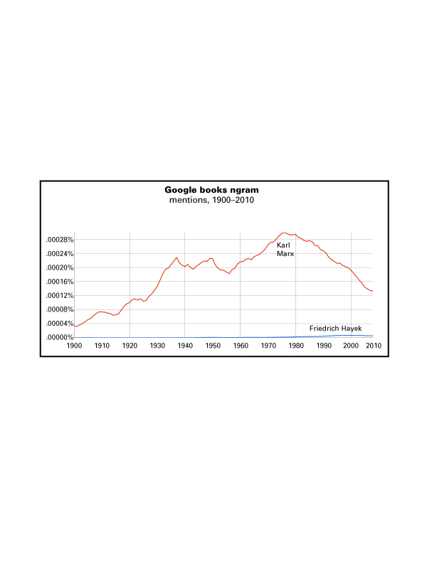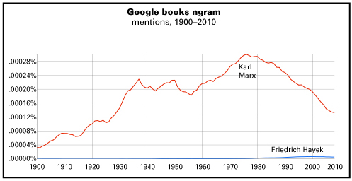 Yeah, everyone’s ngram-ing, so why not me? The number of mentions of Karl Marx vs. Friedrich Hayek in a sample of the books in Google’s database. The original Google chart doesn’t scale nicely, so I’ve retouched it some using Adobe Illustrator. But the relative trajectories are unchanged. To see the Google original, click here: Marx vs. Hayek.