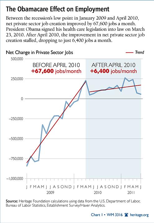 In an effort to prove that Obamacare is responsible for the recent weakening in the economic recovery, James Sherk of the Heritage Foundation presents this graph: