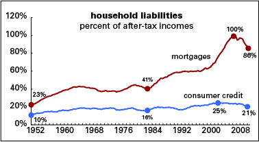 Mortgage debt rose from 41% of after-tax income in 1983 to 100% at the 2007 peak. It’s since come down hard, and the economy and political mood show it. Consumer credit—auto loans and credit cards and such—went from 16% to 25%. It’s come down too.