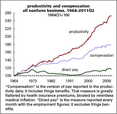 The canonical tech-driven productivity acceleration took hold around 1995. From then until the cyclical peak year of 2007, productivity growth averaged 2.6% a year—4.3% in manufacturing. Compensation, which includes fringe benefits (see graphic caption), rose 1.7% a year—and 1.5% in manufacturing. Direct pay overall rose 0.9% a year—0.3% for factory toilers. During the recession, productivity growth slowed, employment collapsed, and wages rose modestly. In the “recovery years” of 2010 and 2011, productivity growth—this time not from a tech revolution but from sweating a shrunken workforce harder—has resumed growing at a 2.6% pace (2.1% is the very long-term average, by the way). But both compensation and direct pay have fallen by an average of 0.3% a year.