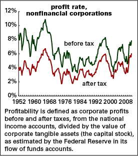 After the profitability collapse of the 1970s, things began to turn around as the Volcker recession and the PATCO firing transformed capital–labor relations. Corporations enjoyed dramatically improving returns from the early 1980s through the late 1990s. Profitability took a major hit in the early 2000s recession, with the bursting of the tech bubble, but it recovered, only to stumble again in the 2007–2009 recession. But it’s staged a remarkable recovery. In the second quarter, nonfinancial firms were more profitable than they were at any time since 1997, in the frenzy of the dot.com moment.
