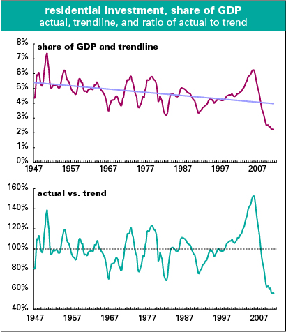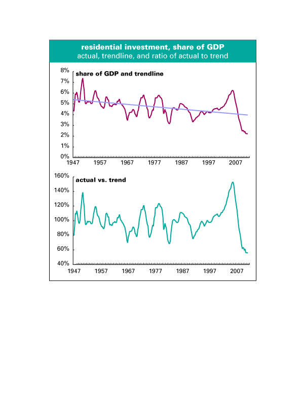 But note the blue trendline on the upper graph: housing’s share of the economy, despite cyclical ups and downs, has been in a steady decline since the highs of the early post-World War II years. The late 90s/early 00s boom was a sharp departure from that downtrend. The lower graph shows the relationship of the actual level to that underlying trend—when it’s above the 100% level (dotted horizontal line), it’s above trend. At the peak in 2005, the housing share of GDP was almost 60% above trend, a record by a comfortable margin. It was also above that trendline for a long time—from 1998 to 2007. Most earlier soujourns above trend were less than half that long. It’s since fallen dramatically, to almost 50% below trend, and it’s likely to stay there for some time.