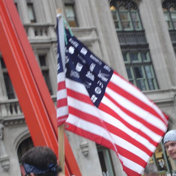 Within, one quickly encountered familiar iconography, e.g., this U.S. flag with corporate logos in place of the stars (photo by Ivan Henwood).