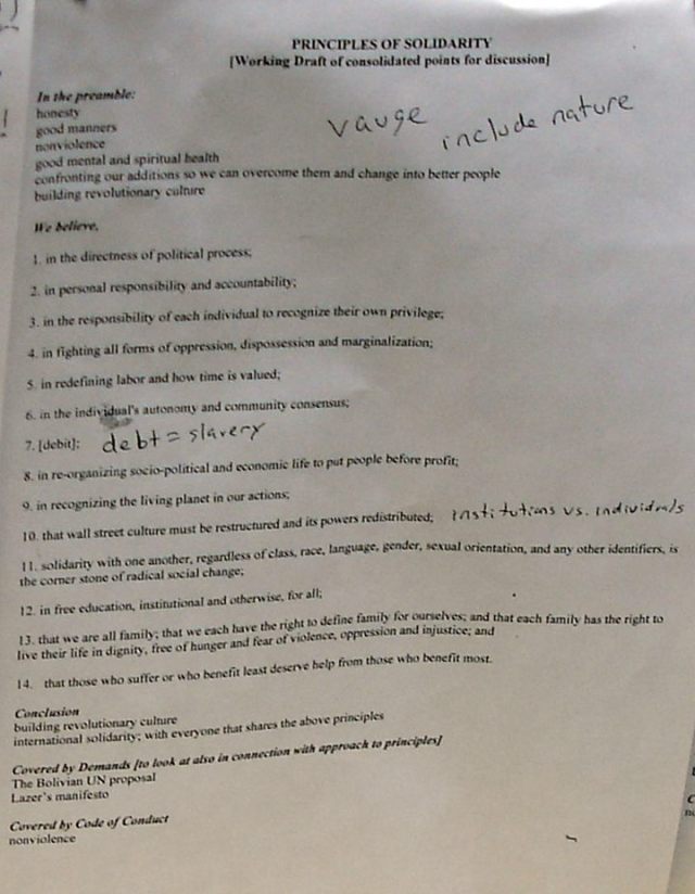 I don`t think it`s accurate to say that we are lacking an agenda and that there is no organization (though not clear if you are saying we are not organized, or we are not a cohesive group). There is in fact a diverse agenda and such a sense of common goals that individuals are taking the initiative to carry out whatever needs to be done. We need your critical eye more than ever before. But I also hope you can simultaneously subscribe to what Arun Gupta has called for in her open letter on the occupation: for the left to let go of it`s self destructive cynical and despairing tendency.