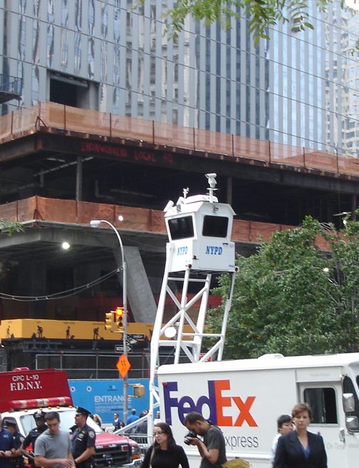 At the corner of Wall and Broadway, things dispersed some, with some of the crowd (including us) heading towards the base camp, Zuccotti Park at the corner of Broadway and Liberty, not far from the “Freedom Tower” (under construction). Here’s what the park looked like from the Broadway side.