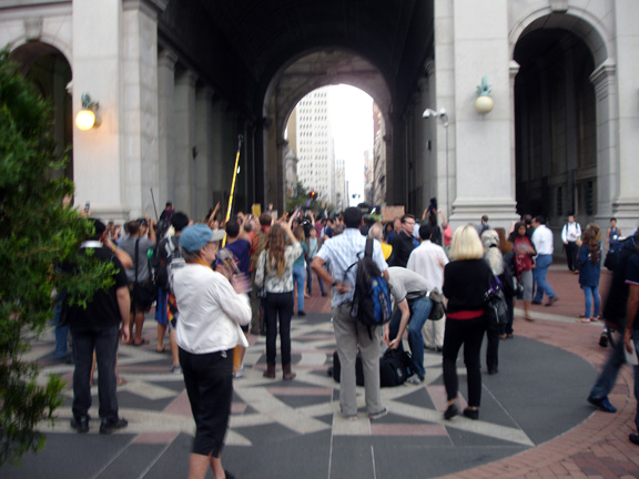 But then there was kerfuffle at the entrance to Police Plaza (through the Manhattan Municipal Building, a borough hall on a rather grand scale). People began chanting “Let them in.” I was too far away to see if the police were blocking the way, but if they were, they didn’t for long as a large throng of reinforcements came in from the main OWS site at Zuccotti Park.