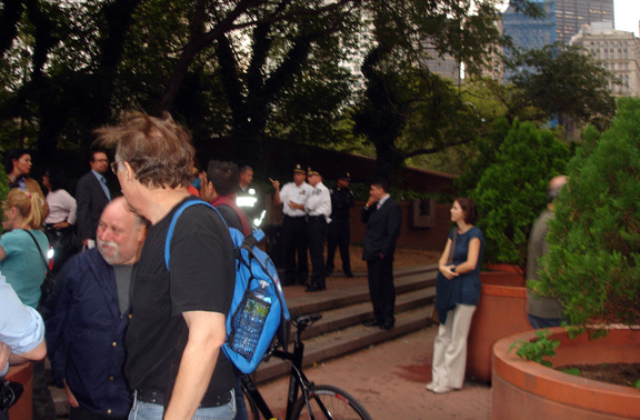 Soon, Police Plaza was filled with a giant, noisy crowd. This is what the area where the white-shirted cops were standing in the photo above looked like about seven minutes after that photo was taken.