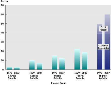 - top 1%: 8% in 1979 to 17% in 2007, more than doubling