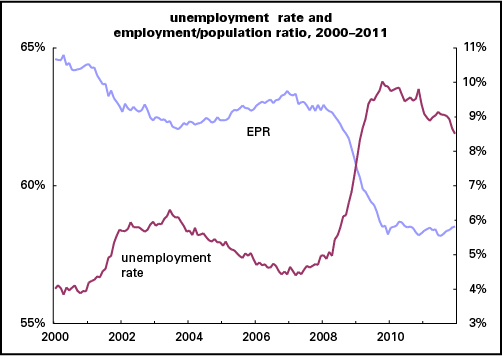 And here’s the unemployment rate and EPR since 2000. Note that the unemployment rate is down 1.5 points since 2009, but the EPR is basically flat. The unemployed have had a hard time finding work, and have been dropping out of the labor force in record numbers. That’s only recently showing signs of turning around.
