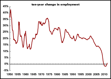 But, as they say on TV, that’s not all. The 2002–2007 expansion was the weakest one in modern history. Jobs were created at a rate that was about a third the average of the post-World War II expansion. The combination of that tepid expansion, which was preceded by a long period of job market weakness, and the Great Recession, meant that employment from late 2009 through late 2011 was actually lower than it was ten years ealier—2% lower at its worst Since the 1930s, there had never been a period in which employment in the U.S. contracted over the course of a decade. The worst previous ten-year reading since the 1930s was a gain of 22% over ten years. We’re now recovered to where we’re not quite 1% above where we were ten years ago. That contrast is really striking: 22% previous worst, vs. an actual decline of about 3%.Back in the 1990s, cheerleaders used to love to talk about the Great American Job Machine. That machine has clearly popped a few gaskets.