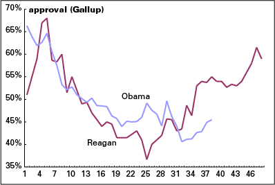 And how about approval? On that, Obama’s doing a little better than might be expected given those crummy income numbers—but still, Reagan was 9 points ahead of Obama (54% vs. 45%). And Reagan was up 17 points over the previous year—Obama’s down 4.
