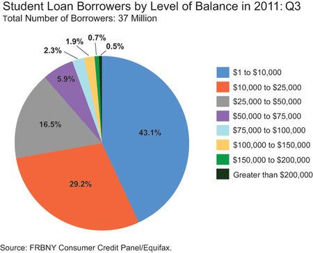 About one-quarter of borrowers owe more than $28,000; about 10 percent of borrowers owe more than $54,000. The proportion of borrowers who owe more than $100,000 is 3.1 percent, and 0.45 percent of borrowers, or 167,000 people, owe more than $200,000.
