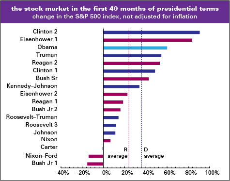 Since the beginning of Obama’s term in office in January 2009, the S&P 500 is up 60%—twice the average of all the 18 presidential terms since Roosevelt’s third. (Adjusting for inflation, Obama’s score is three times the average.) These results are not particularly surprising. The 40-month average for Democratic presidents is 36%; for Republicans, 24%. Still, Obama’s 60% is nearly twice his party’s average.