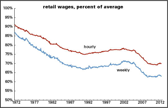 Or, looked at another way, the average retail hourly wage was 91% of that for all workers in 1972 (when the BLS’s retail wage stats begin) to 70% in October 2012. The decline in the weekly ratio was even steeper—from 87% of the average in 1972 to 63% in October. Here’s a graph of that history.