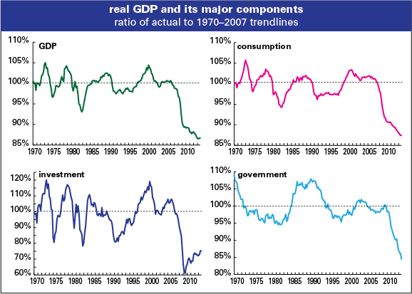 By the way, here’s a graph of actual real U.S. GDP and its major components relative to their long-term (1970–2007) trendlines through the end of 2013. Note how things fell off a cliff in the recession. GDP, consumption, and government spending are all about 15% below where they’d be had they continued to grow in line with their long-term trend. (The hysteria over out-of-control government spending looks ludicrous in the light of this graph.) Investment is about 25% below where it “should” be. thanks largely to the housing collapse, though it’s staging something of a recovery. The other components have yet to begin closing the gap, because the recovery’s been so weak.