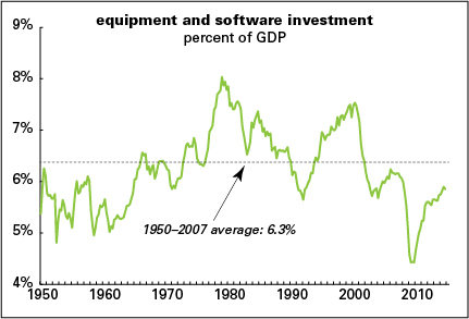 What happened? For one, the rise in investment in equipment and software—much of that in information technology (IT)—that drove the late-1990s acceleration went into reverse, as the following graph shows.